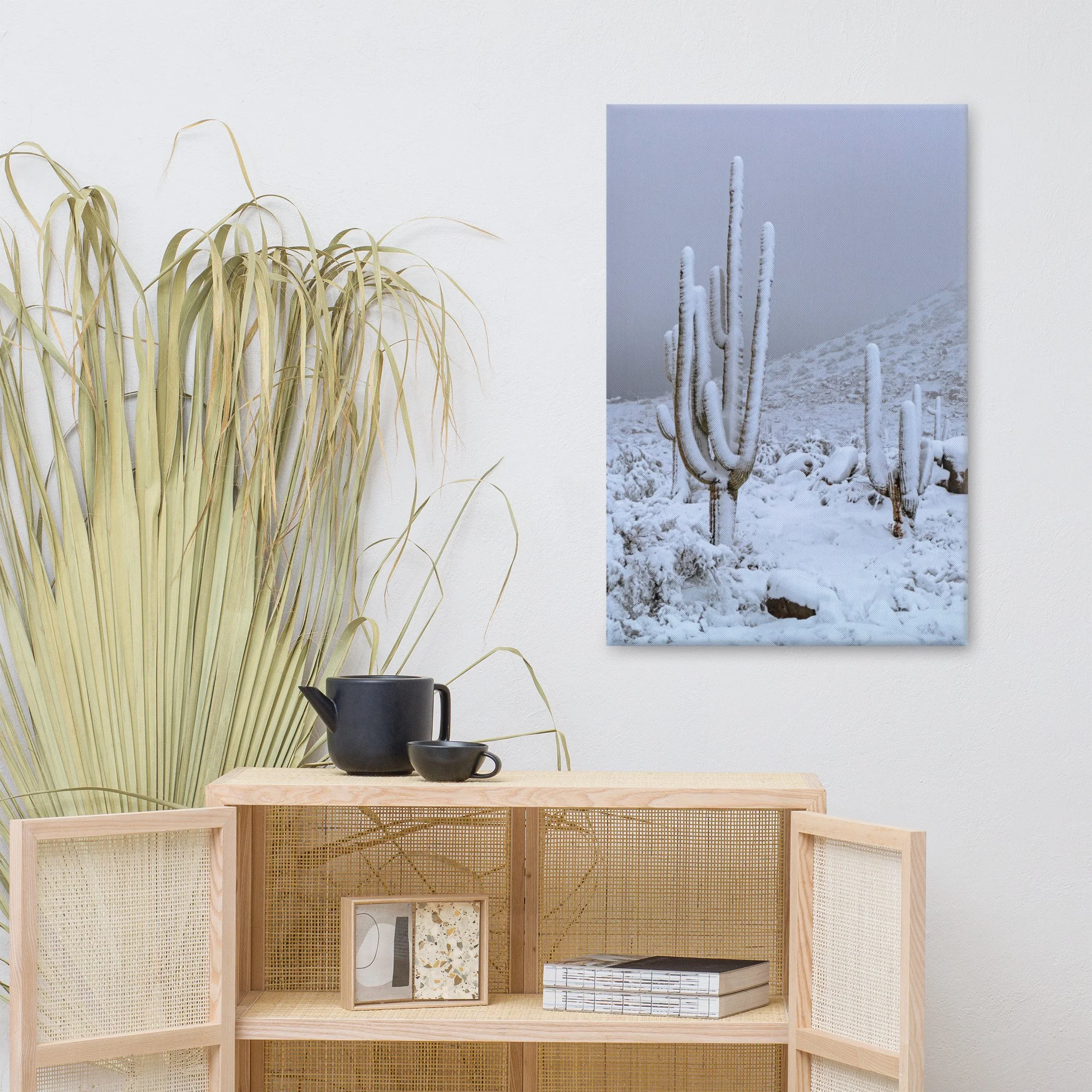Captured at the Browns Ranch trailhead in North Scottsdale Arizona, this unique desert vertical landscape print with snow clad cactus and mountains is a real conversation piece.